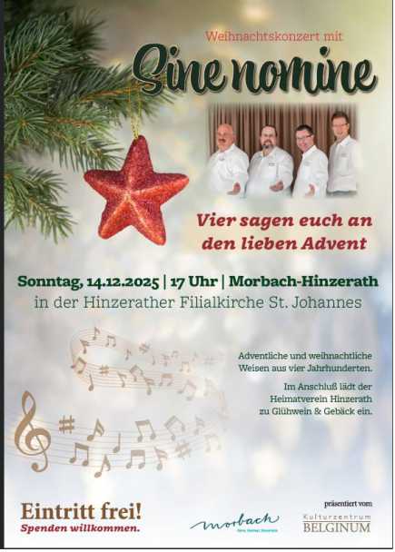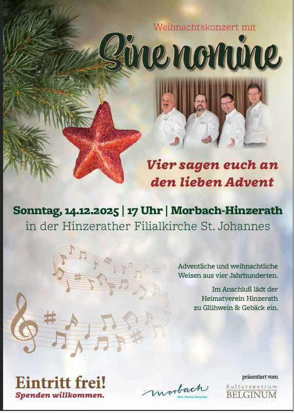 Am 3. Adventssonntag, dem 14. Dezember 2025, lädt das Quartett „Sine nomine“ um 17.00 Uhr zu einem stimmungsvollen Weihnachtskonzert in die Filialkirche St. Johannes in Morbach-Hinzerath ein. Unter dem Titel „Vier sagen euch an den lieben Advent“ präsentieren die vier Sänger ein abwechslungsreiches Programm mit adventlichen und weihnachtlichen Weisen aus vier Jahrhunderten.